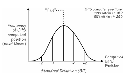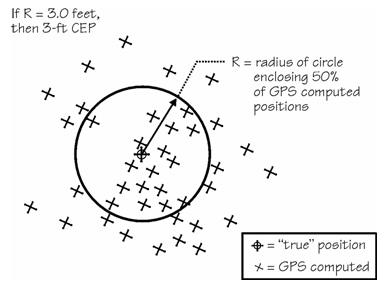 Параметры точности – это статистические числовые параметры, обозначающие доверительный интервал. Параметр точности 30 см не означает, что приемник GPS каждый раз определяет позицию с погрешностью 30 см. В большей степени он свидетельствует о том, что погрешность позиции, определяемой приемником, вероятней всего, составляет менее 30 см. Обычно точность обозначается как СЕР (50%), RMS (63-67%) или 2RMS (95%). Упрощенно можно представить себе круг вокруг какой-то заданной позиции, на которой находится приемник GPS. Тогда 30 см (CEP) означает, что 50% измерений позиции приемником GPS находятся в диапазоне 30 см. Параметр 60 см (2 RMS) может соответственно пониматься следующим образом: в 95% времени погрешность позиции приемника меньше 60 см. Тот же самый показатель с припиской RMS или СЕР означает, что точность значительно ниже.
