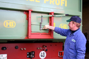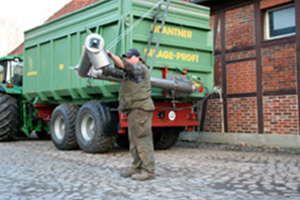 1) Проверьте, достаточно ли надежно шнек закреплен на прицепе (транспортном средстве)?!2) Проверьте гидравлическую систему на плотность.3) Проконтролируйте на безопасном расстоянии фиксирующее кольцо скользящей опоры в момент движения шнека вниз. Если оно разъединилось, проверните его против часовой стрелки и закрепите.