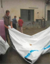 12. Если упаковку/плющение по какой-то причине придется приостановить, достаточно остановить вальцовую мельницу. Давление тормозов трогать не надо. Когда упаковка опять продолжится, получится единый и ровный рукав без провисов или слишком толстых мест. 13. Когда работа по упаковке заканчивается, сначала закрываете подачу зерна на мельницу, оставшееся на вальцах зерно пропускается через вальцы, и останавливаете мельницу. Спускаете давление в тормозах, и трактор медленно проезжает вперед на 2-3 м, чтобы высвободить пустой конец рукава. 14. Рукав отрезается, и пустая часть рукава плотно скручивается, например, на доску в сторону заполненного рукава. Если в конце рукава останется воздух, можно проделать в рукаве маленький надрез и выдавить воздух. Надрез сразу заклеивают поставляемым с рукавом скотчем для заплат.