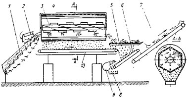 Ковшовый элеватор 8, состоящий из двух цепей, между которыми установлены ковши, имеет прямоугольный контур. В нижней ветви элеватора происходит очистка зерна от легких примесей с помощью потока воздуха от вентилятора.