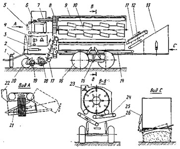 Подборщик включает шарнирно подвешенную раму, опирающуюся спереди на два пневматических колеса 20, на которой установлены барабанный подборщик 19 с пружинными пальцами и промежуточный передаточный шнеково-пальчатый барабан 18. Барабан 18 имеет на концах два шнека левой и правой навивки, которые сужают поток поступающей массы от 1,45 до 0,56 м. Пальцы в средней части барабана установлены шарнирно на валу, расположенном эксцентрично относительно оси барабана. Подъем подборщика в транспортное положение осуществляется гидроцилиндром через двуплечий рычаг и трос.