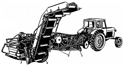 Лукоуборочная машина ЛКГ-1,4: 1 — подкапывающий лемех; 2 — грохоты; 3 — поперечный транспортёр; 4 — выгрузной транспортёр.