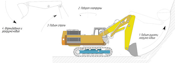 Схема рабочего цикла гидравлического экскаватора с прямой лопатой