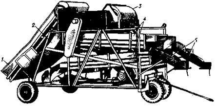 Сортировка лука СЛС-7А: 1 — загрузочный транспортёр; 2 — воздуховод; 3 — вентилятор; 4 — решётные станы; 5 — лотки.