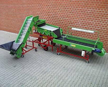 СОРТИРОВКА ЛУКА, стационарная машина для сортирования лука. Осн. рабочие органы: загрузочный скребковый транспортёр; центробежный вентилятор с воздуховодом; 2 решётных стана, установленные под углом к горизонту; лотки для отвода отсортированного лука. Лук-севок, засыпанный в приёмный лоток загрузочного транспортёра , захватывается скребками и подаётся на первое решете верх. решётного стана. При падении с транспортёра луковицы проходят через воздушный поток, в к-ром происходит отделение лёгких примесей (чешуя, усохшие луковицы). На первом решете задерживаются луковицы диам. св. 30 мм (лук-выборок из севка); двигаясь по решету, они попадают в лоток и затем в тару. Провалившиеся через отверстия решета луковицы попадают на второе решето; луковицы диам. си. 24 мм (севок I гр.) двигаются по решету, диам. менее 24 мм попадают в поддон решётного стана и через лоток — в ниж. решётный стан. Здесь с первого решета сходит севок II гр. (диам. 15 — 24 мм), со второго — севок III гр. (диам. 10 — 14 мм).