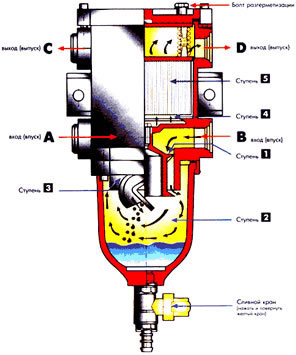 Непосредственно под фильтроэлементом, после прохождения лопастей, топливо попадает в просторную камеру, за счет чего снижается скорость потока. Топливо резко теряет скорость, в результате чего еще более мелкие частицы оседают на внутренних стенках корпуса и по мере формирования крупных комков сползают в колбу.