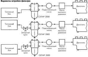 Топливные сепараторы Separ 2000 устанавливаются во всасывающей магистрали топливной системы, между топливным баком и основным топливным насосом двигателя.