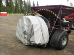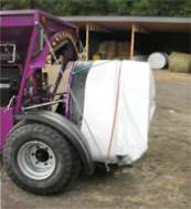 7. Убедитесь, что тормоза и передача трактора свободны! Под давлением трамбуемого упаковочным шнеком зерна трактор и упаковщик отодвигаются вперед. Трансмиссия трактора крутит мельницу и упаковщик со скоростью 540 оборотов в минуту Трактор должен быть расположен на одной линии с упаковщиком, чтобы рукав получался бы ровным. При необходимости надо управлять трактором по мере заполнения рукава.