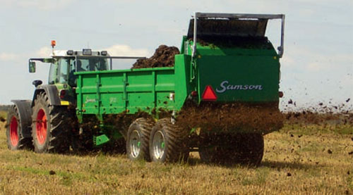 Навоз с подстилочной соломой можно разбрасывать непосредственно из фермы. Навоз с сухой соломой разбрасывается и может вноситься в почву при пахоте. Сухой куриный навоз с длинной соломой мелко измельчается. Система разбрасывания Самсон потребляет энергии меньше на 40-50% по сравнении с традиционными горизонтальными барабанами и вращающимися дисками.