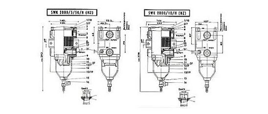 МВ – для бензина (Сепар SWK-2000/5МВ). Н или НZ – с полуавтоматическим или автоматическим подогревом (Сепар SWK-2000/5/50 Н, SWK-2000/10 Н). М – с металлическим отстойником. МК – с металлическим отстойником и датчиком уровня воды. U – сдвоенные с переключением для слива отстоя без остановки двигателя.