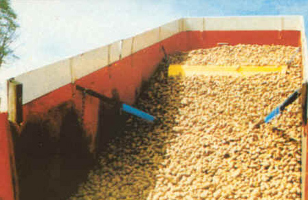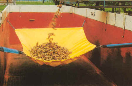 Прочно укреплённая по боковому краю прицепа самосвала труба с 2-мя подвесными цепями. Неизнашиваемое поливиниловое полотно, натянутое по обеим боковым сторонам и по заднему краю на направляющие кабели. Два эластичных кручёных каната, которые при приёме груза растягиваются так, что полотно с продуктом плавно опускается на дно прицепа.