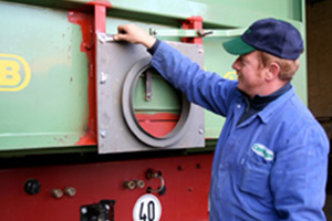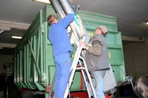 1) Проверьте, достаточно ли надежно шнек закреплен на прицепе (транспортном средстве)?!2) Проверьте гидравлическую систему на плотность.3) Проконтролируйте на безопасном расстоянии фиксирующее кольцо скользящей опоры в момент движения шнека вниз. Если оно разъединилось, проверните его против часовой стрелки и закрепите.