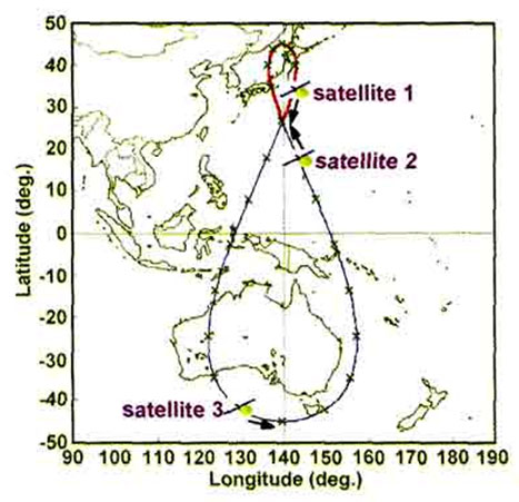Всего в спутниковый сегмент войдут 3 спутника, орбиты которых будут выбраны таким образом, чтобы их подспутниковые точки описывали на земной поверхности одну и ту же траекторию с одинаковыми временными интервалами. При этом, по крайней мере один спутник будет виден под углом места более 70 градусов в любое время на территории Японии и Кореи. Эта особенность и определила название навигационной системы -Quasi-Zenith. Антенны спутников будут передавать сигналы практически во всей зоне видимости спутников, обеспечивая навигацию и передачу сигналов точного времени. Однако сигналы L1-SAIF, которые включают в себя различные поправки, позволяющие повысить точность измерений с помощью сигналов GPS и, возможно, GALILEO, будут передаваться с помощью параболической антенны только на Японию.