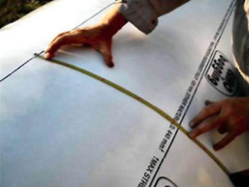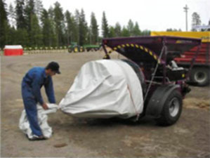 12. Если упаковку/плющение по какой-то причине придется приостановить, достаточно остановить вальцовую мельницу. Давление тормозов трогать не надо. Когда упаковка опять продолжится, получится единый и ровный рукав без провисов или слишком толстых мест. 13. Когда работа по упаковке заканчивается, сначала закрываете подачу зерна на мельницу, оставшееся на вальцах зерно пропускается через вальцы, и останавливаете мельницу. Спускаете давление в тормозах, и трактор медленно проезжает вперед на 2-3 м, чтобы высвободить пустой конец рукава. 14. Рукав отрезается, и пустая часть рукава плотно скручивается, например, на доску в сторону заполненного рукава. Если в конце рукава останется воздух, можно проделать в рукаве маленький надрез и выдавить воздух. Надрез сразу заклеивают поставляемым с рукавом скотчем для заплат.