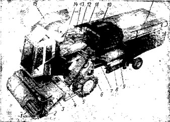 Привод гидронасосов и молотилки осуществляется от двигателя 4 СМД-17. Рабочие органы комбайна, кроме молотилки, имеют привод от гидродвигателей. Осветительные приборы на комбайне получают питание от трактора.