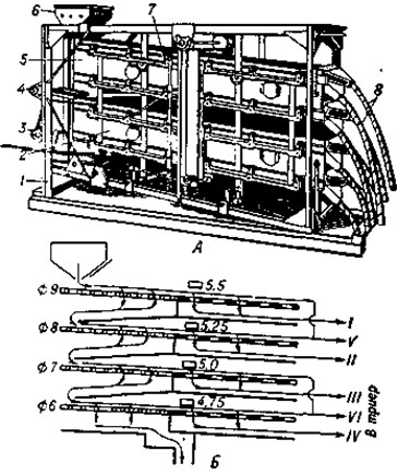 Калибровочная машина КСК-1: А — общий пил (1 — рама, 2,5 — решётные станы, 3,7 — механизм очистки решёт, 4 — эксцентриковый вал, 6 — бункер семян, 8 — трубопроводы семян); Б — технологическая схема (1 — VI — номера фракций).