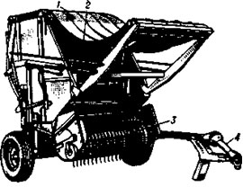 Пресс-подборщик рулонный ПРП-1,6: 1 — прессовальные ремни; 2 — прессовальная камера; 3 — подборщик; 4 — привод.