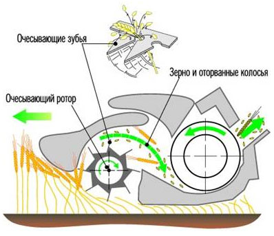 При поступательном движении комбайна, зубья вращающегося ротора прочесывают растения снизу вверх, и отрывают колосья от стеблей.
