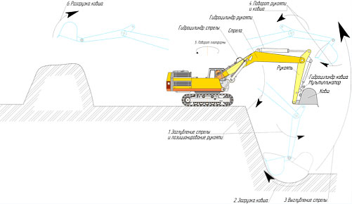 Схема работы гидравлического экскаватора с обратной лопатой
