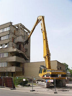 Экскаватор CATERPILAR с манипулятором осуществляет демонтажные работы с помощью ножниц для резки железобетона