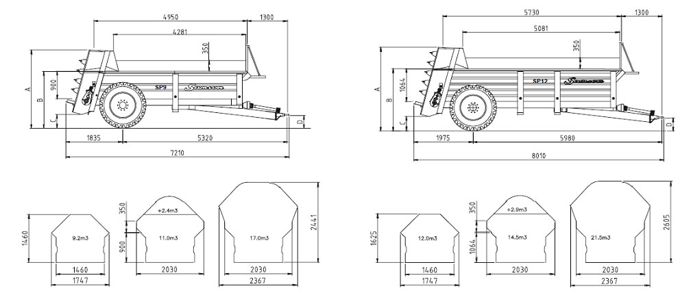 Серия SP (SP9, 11, 12 и 15) — универсальные разбрызгиватели, которые могут вносить вещества от 3 т/Га до 70 т/Га.